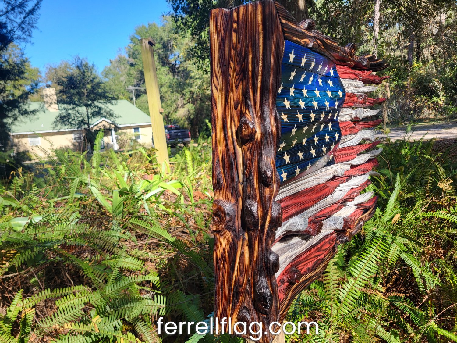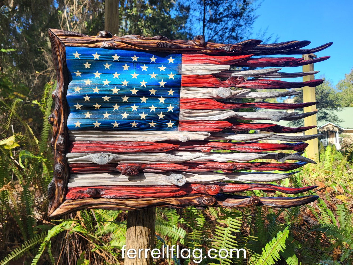 Each star is carved by hand, and the colors are a special blend of KEYDA dyes. Each strip has detailed carving on it and a trim package that is absolutely stunning. This masterpiece is built to be passed down from one generation to the next. You may contact me at [email protected] to discuss a certain type of flag you would like handcrafted for a Veteran or anyone else you want to leave a lasting impression on.